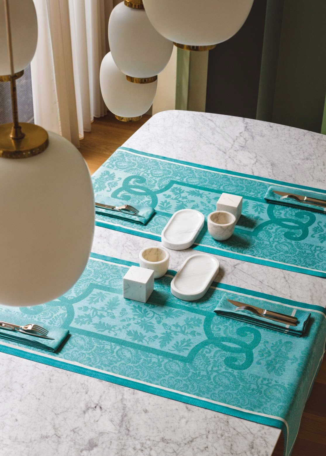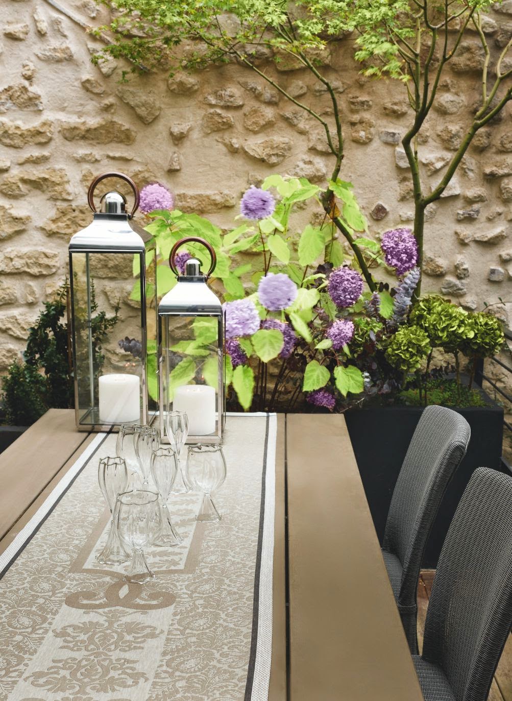 Le Jacquard Francais has again created a note-worthy collection, both in elegance and design and also functionality. Several of their new 2015 tablecloths have a matte-acrylic finish on the top which is resistant to spills and pretty much anything. You never have to place this tablecloth in the washing machine (but you can), and you only use a sponge to clean. That's it! It's also difficult to tell the 100% cotton cloths from the acrylic-coated cloths, in person or in photographs, until you actually touch them.